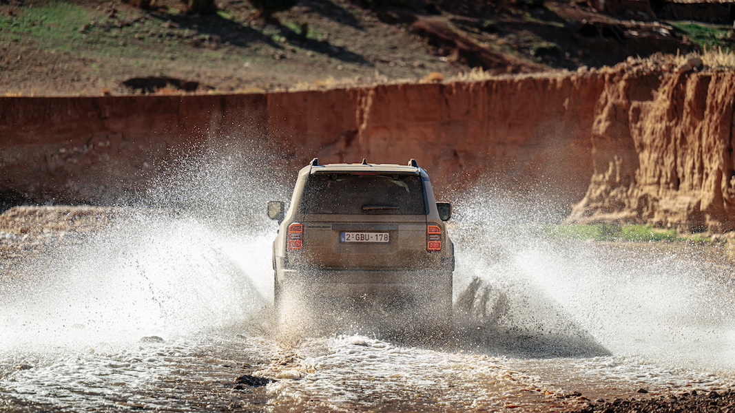 Permanenter Allradantrieb mit Untersetzung, 100 % sperrbare Differenziale, adaptive Fahrprogramme für Sand, Fels, Schnee und Schlamm, eine Watttiefe von über 70 cm und Böschungswinkel, die selbst Profi-Geländewagen fordern.