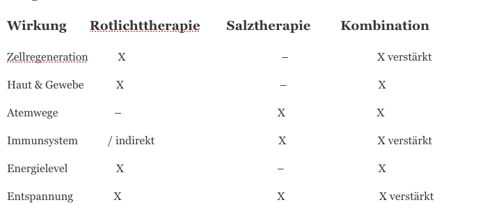 Durch die Kombination entsteht ein deutlich breiterer Effekt. Die verstärkten Effekten der Kombination von Rotlicht- und Salztherapie werden durch die gleichzeitige positive Beeinflussung von Haut, Zellfunktion, Durchblutung und Atemwegen unterstützt.