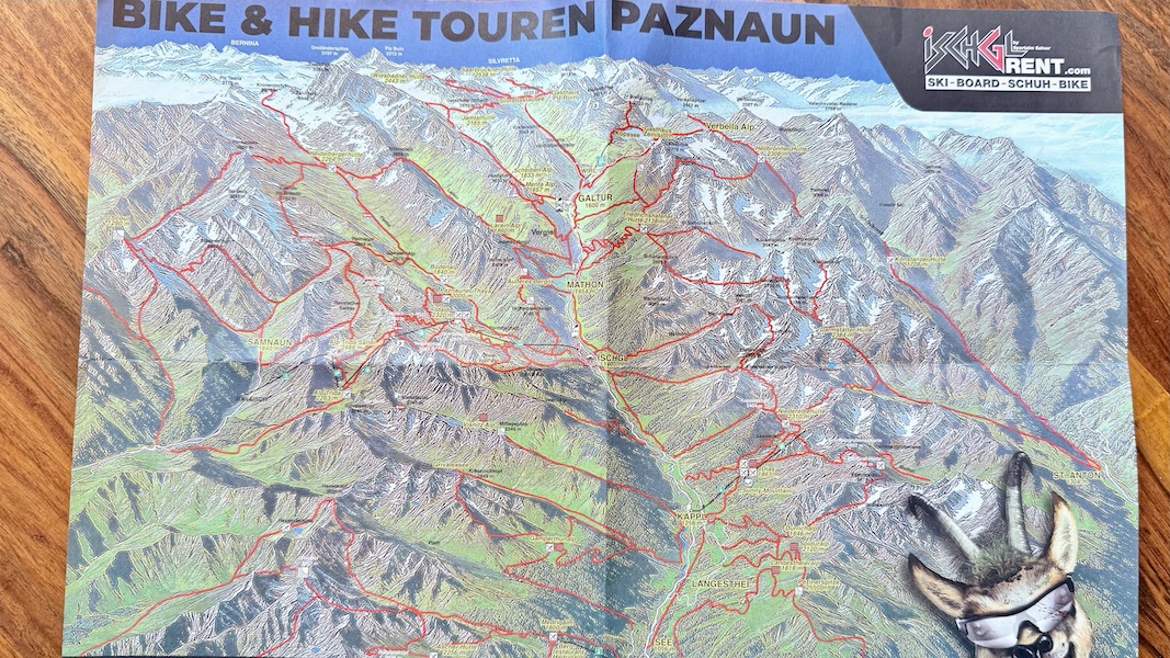 Der Ausgangspunkt und Treffpunkt mit unserem Guide Christian Zangerle ist in Galtür bei der Ski-&Snowsportschule. Nach einem ersten Abklären unseres heutigen Tour-Zieles, meint Christian, wir fahren zum Start einmal den leichtesten Trail, einerseits zur Gewöhnung, andrerseits zur Beurteilung des Könnens und der Geschicklichkeit. Dieser Test ist vergleichbar mit dem Vorfahren in der Skischule und anschließender Gruppenzuteilung. Zur weiteren Fahrt nehmen wir samt unseren Bikes den Lift auf den Alpkogel.