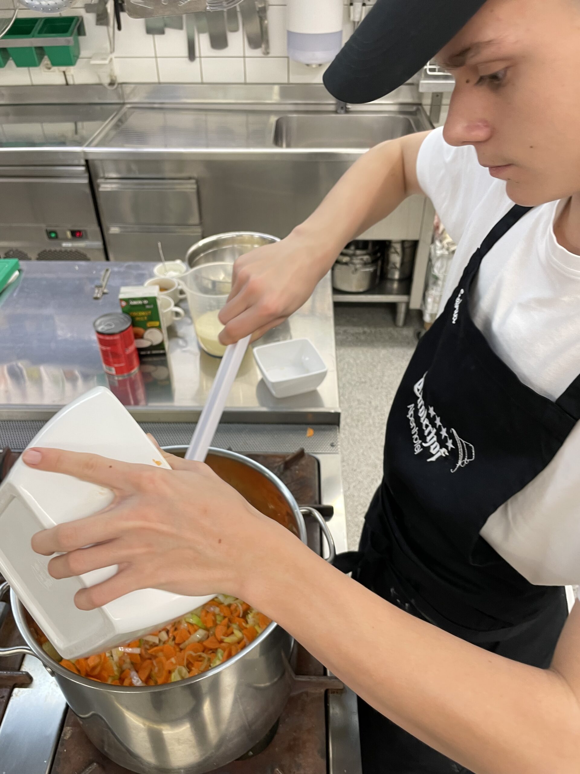 Anschließend Karotten, Lauch und Apfel dazu geben und mit der zerlassenen Butter anschwitzen.