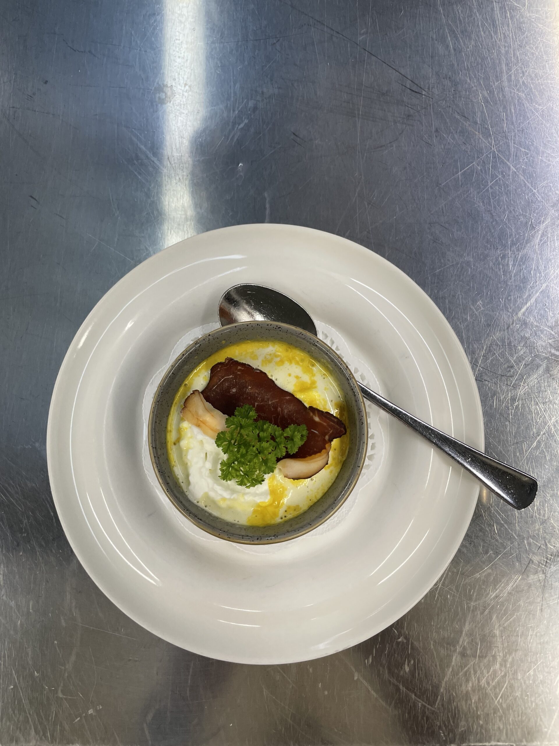 Kann mit einem Speckchip und Petersilie auf einer kleinen Sahnehaube oder mit feinen Karotten und Lauchstreifen und Basilikum garniert werden.