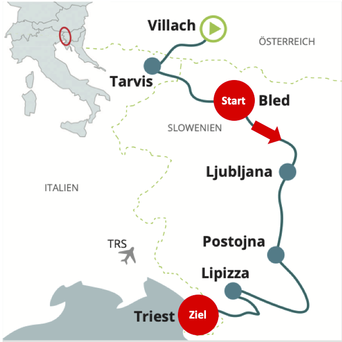 Nachdem ich bereits vor inzwischen 3 Jahren eine mehrtägige Radtour von Villach nach Grado unternahm, wählte ich dieses Mal bei FunActive die Tour von Bled nach Triest aus. Diese Tour kann man noch um zwei Etappen verlängern und zwar wenn man ab Villach bis Tarvis und am 2. Tag dann von Tarvis nach Bled fährt. Somit sind es dann gesamt sechs Tage am Rad. Nachdem ich nicht soviel Zeit hatte, fiel die Wahl von Bled nach Ljubljana über Postonja, nach Lipica und das Endziel Triest. Am Vortag der Radtour fuhr ich mit dem Auto, samt Rad nach Bled und bezog das gebuchte Hotel. Nach einem kleinen Spaziergang an der Seepromenade kehrte ich auf einer die viel Seeterrassen ein und wollte einen Kaffe und die berühmte Bleder Cremeschnitte essen. Es war dies kein leichtes Unterfangen, denn ohne ein ausgiebiges Essen (Hauptgericht samt Beilagen) wollte man nicht bedienen. Wohlgemerkt es war 4 Uhr nachmittags. So suchte ich weiter und fand dann doch noch eine nette Terrasse. Übrigens bei der wirklich köstlichen Cremeschnitte dachte ich mir, die Hotels in Bled werden es schon noch einmal billiger und freundlicher geben, wenn der Tourismus nachlässt.