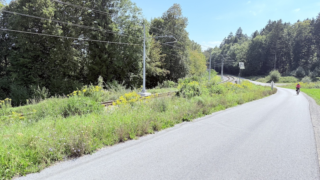 Der Wetterbericht sagt nichts Gutes. Daher entschloss ich mich mein Regenzeug anzulegen und zum nur 800 Metern entfernten Bahnhof zu fahren und einen Teil der Strecke mit dem Zug zu fahren. Ticket um 5,60 gekauft und eine kurze Wartezeit. Inzwischen handelt es sich um ein richtiges Gewitter mit Donner und Starkregen. Nach einer kleinen Verspätung kommt mein Zug nach Divaca. Von dort sind es mit dem Rad nach Lipica nur mehr 9,5 km. Aber es kommt anders: Als ich ausstieg und mich aufs Rad setze, Gewitter und Donner. So kehrte ich unweit des Bahnhofs ein, aß zu Mittag und wartete mit anderen Radfahrern ab, bis sich das Wetter beruhigt.