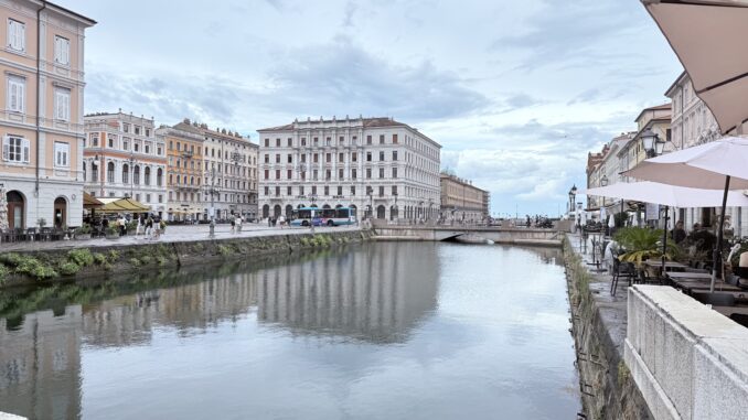 Ich fahre durch das Val Rosandra bei Pesek, bevor man über die ehemalige Bahntrasse der Parenzanabahn hinunter nach Triest fährt. Die Profis würden sagen „Heute ist eine Rolleretappe“. Eigentlich bemerkt man gar nicht das man schon in Italien ist und plötzlich sieht man unten schon den Hafen in Triest. Kurz danach komme ich zur Ortstafel Triest und rolle mit meinem Rad direkt zum Hafenpromenade und gönne mir einen Aperol Spritz. Es ist alles gut gegangen, keine Defekte, keine Probleme bei Laden des E-Bikes, den Weg doch einigermaßen gefunden. Aber das gehört doch auch dazu. Nach rund 265 km fahre ich in mein Stadthotel und beschließe einen kleinen Stadtbesuch zu Fuß zu unternehmen. Welche Pracht in Triest herrscht, kennen Sie vermutlich.